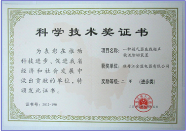 2010年,“一種凝汽器在線超聲波旋流除垢裝置”在電力系統(tǒng)200MW機(jī)組凝汽器安裝使用,填補(bǔ)了國內(nèi)空白,該項(xiàng)目于2012年獲得黑龍江省人民政府 “科學(xué)技術(shù)二等獎(jiǎng)”,2013年,獲得國內(nèi)“首臺套獎(jiǎng)勵(lì)”。